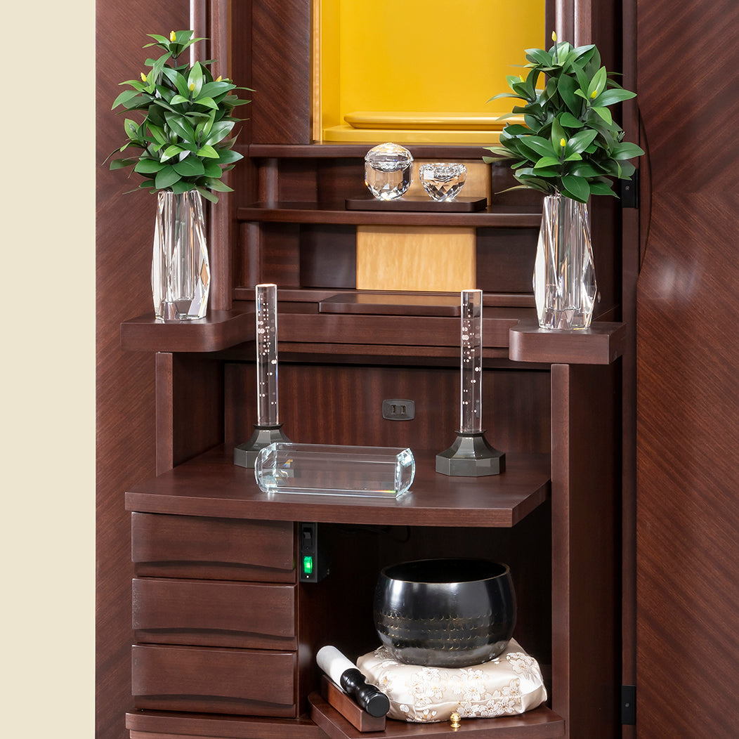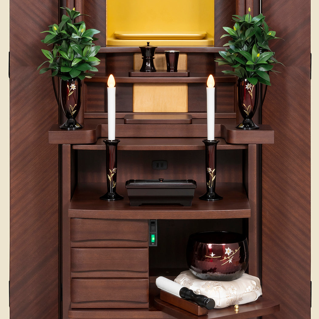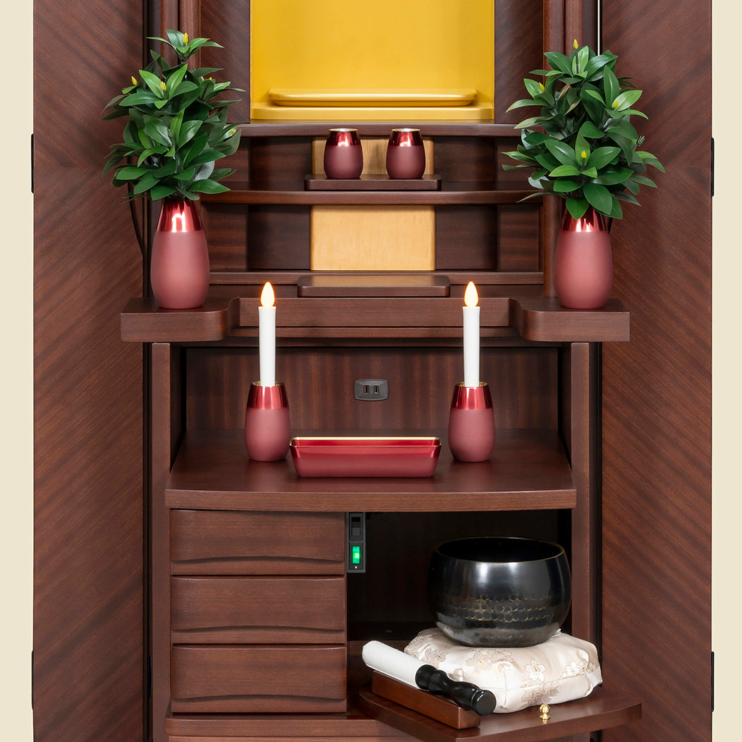 花台スライド使用で、しきみがご本尊を遮ることなく仏具のレイアウトが可能です。 大きめのしきみを好まれるお客様、お仏壇内をスッキリ見せたいお客様におすすめです。