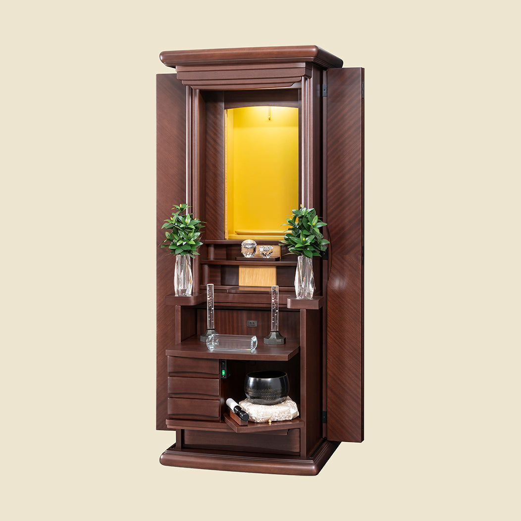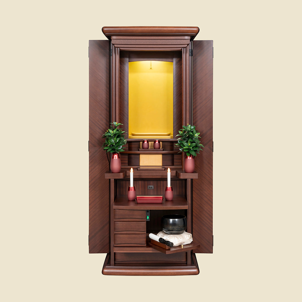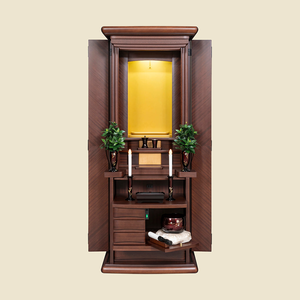 花台スライド使用で、しきみがご本尊を遮ることなく仏具のレイアウトが可能です。 大きめのしきみを好まれるお客様、お仏壇内をスッキリ見せたいお客様におすすめです。