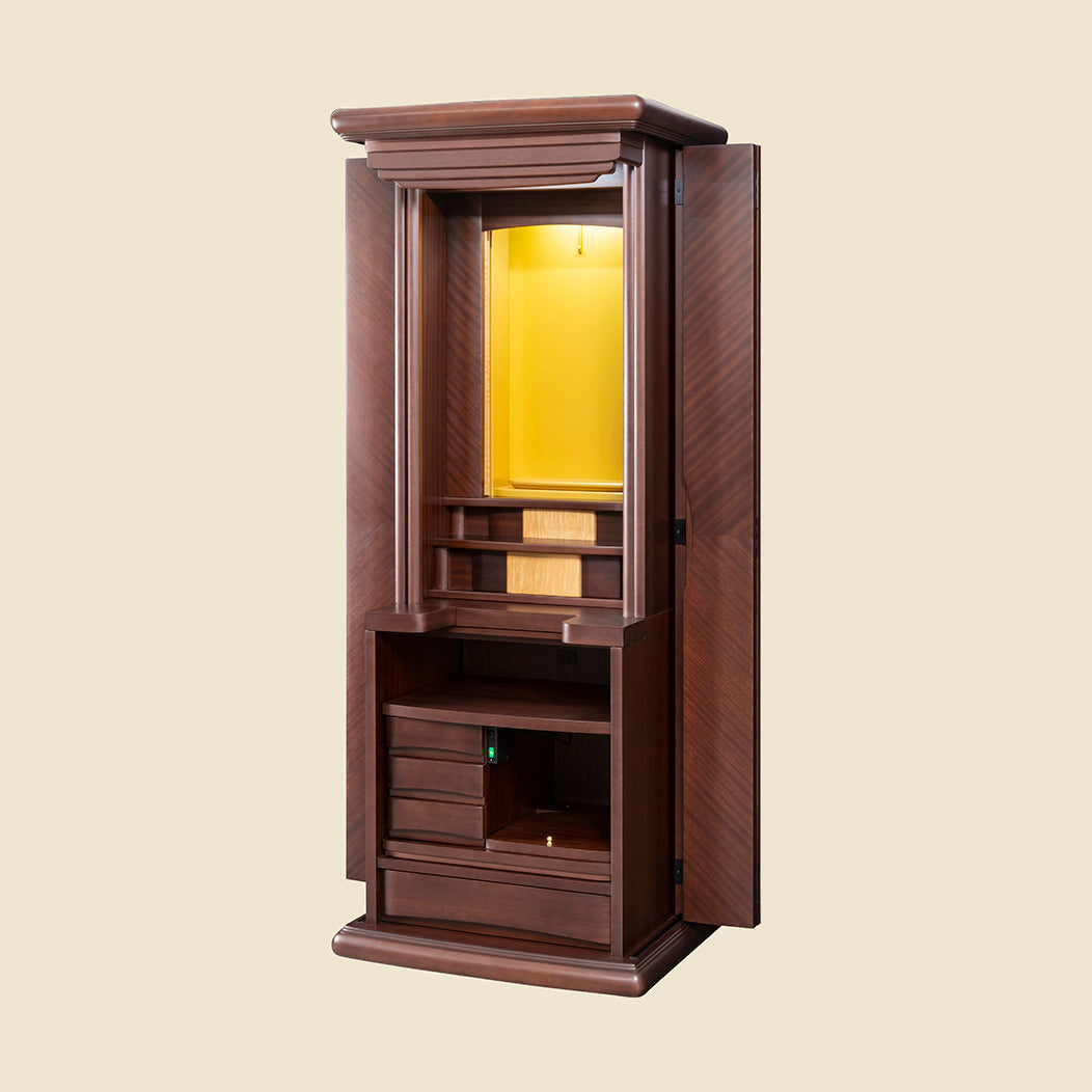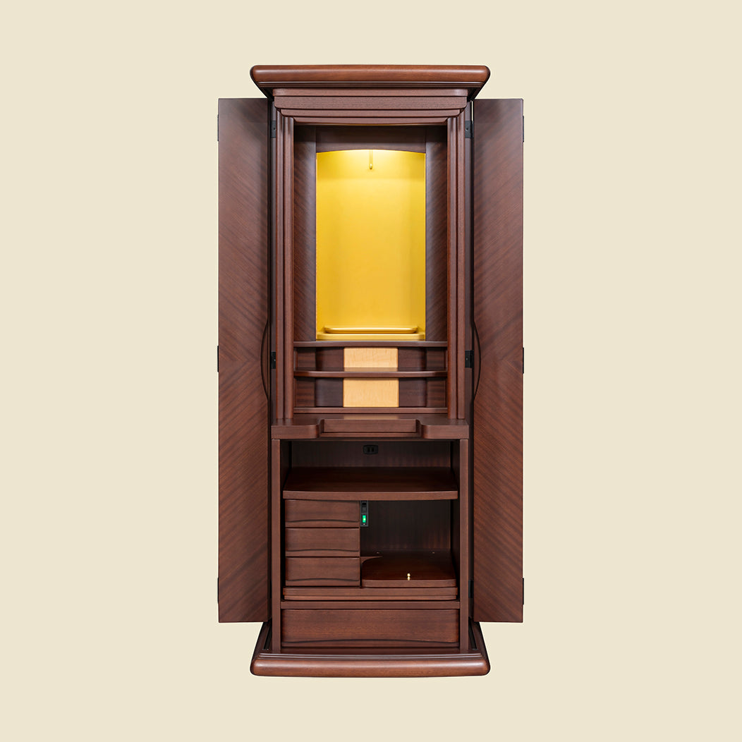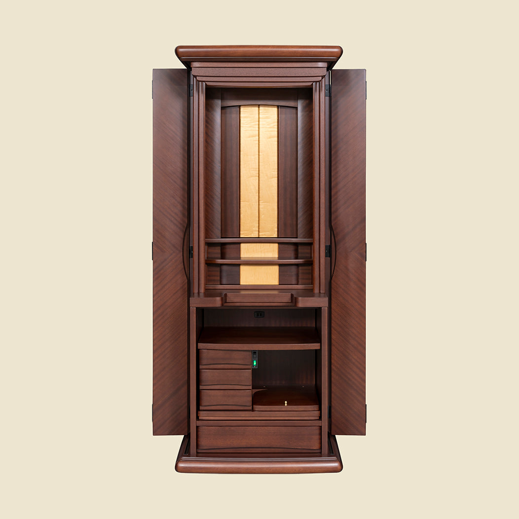 煌く木目の美しさ表面に独特の美しいリボン杢が特徴なサペリを矢羽根張りをすることで、より美しくデザイン性の高いお仏壇に仕上がりいました。