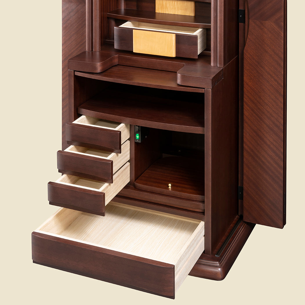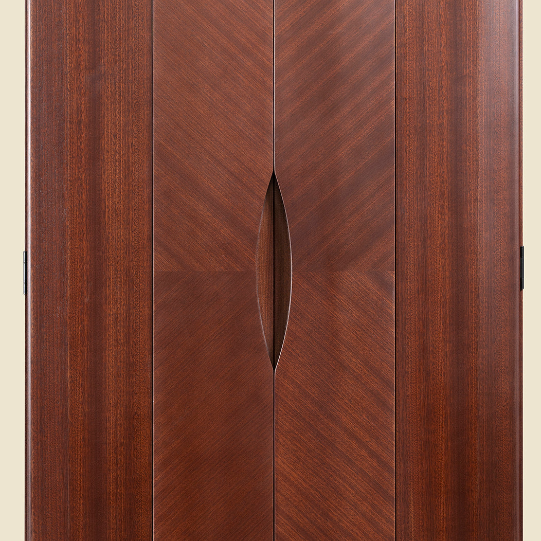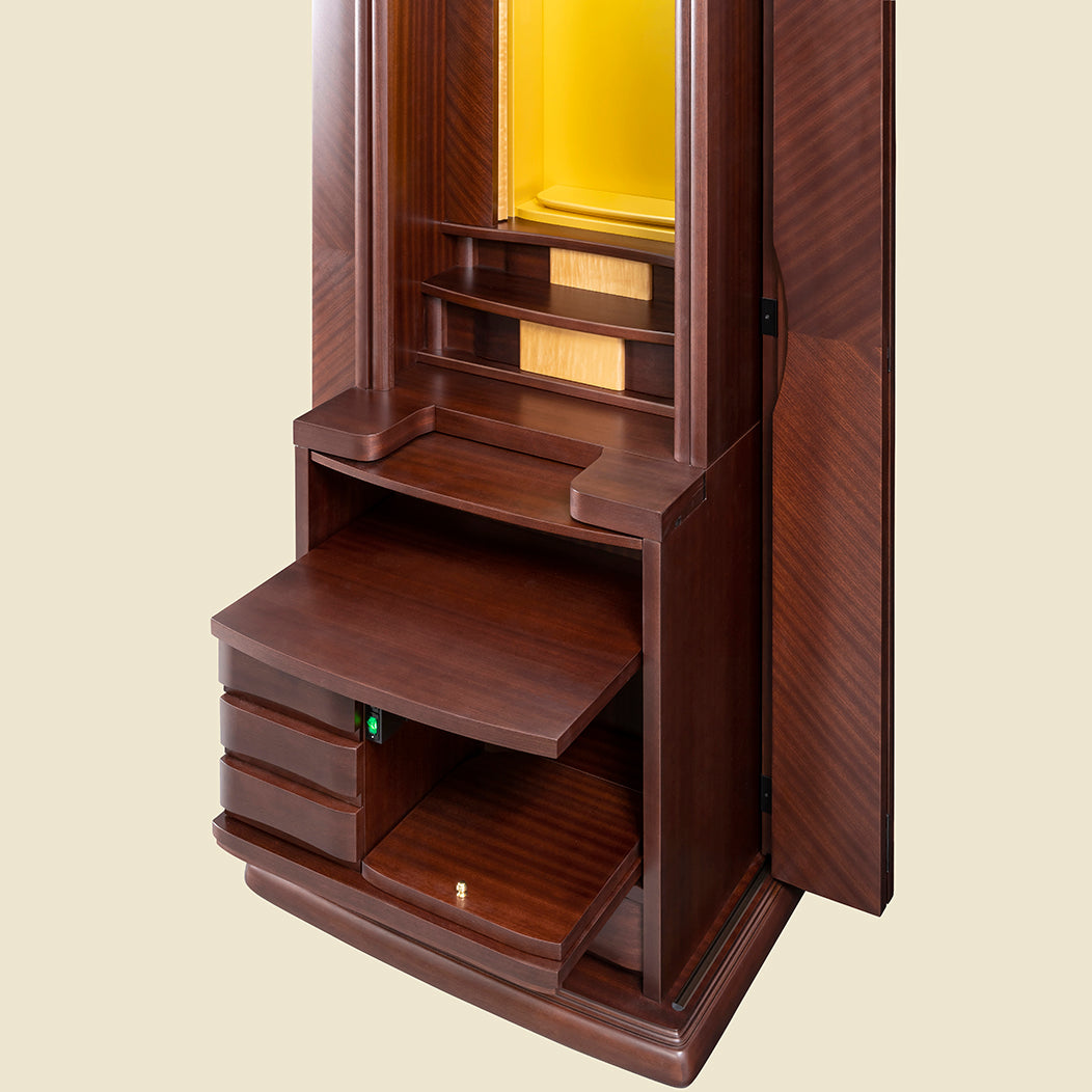 煌く木目の美しさ表面に独特の美しいリボン杢が特徴なサペリを矢羽根張りをすることで、より美しくデザイン性の高いお仏壇に仕上がりいました。