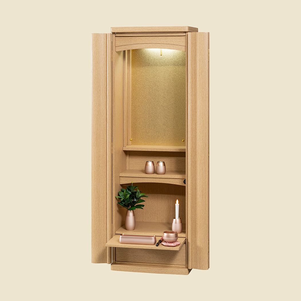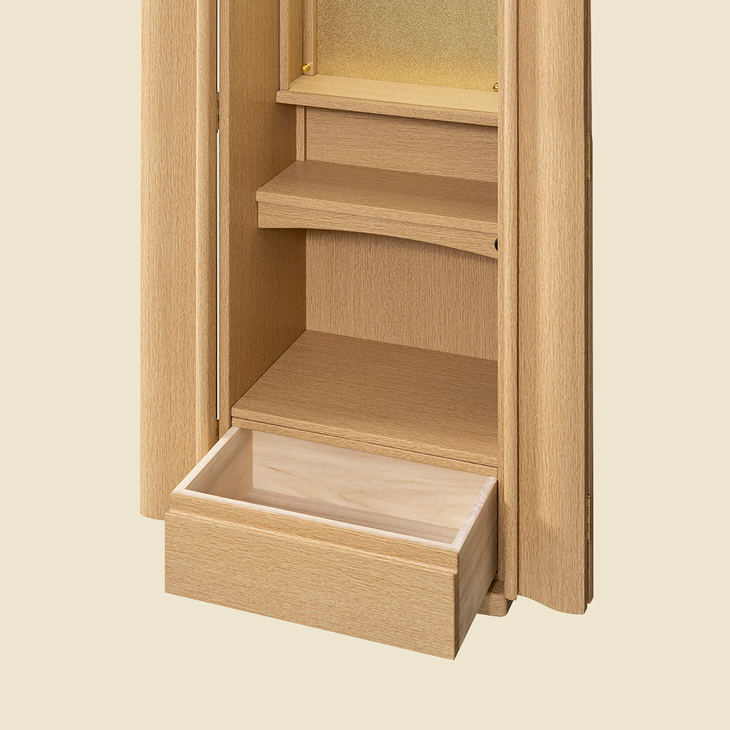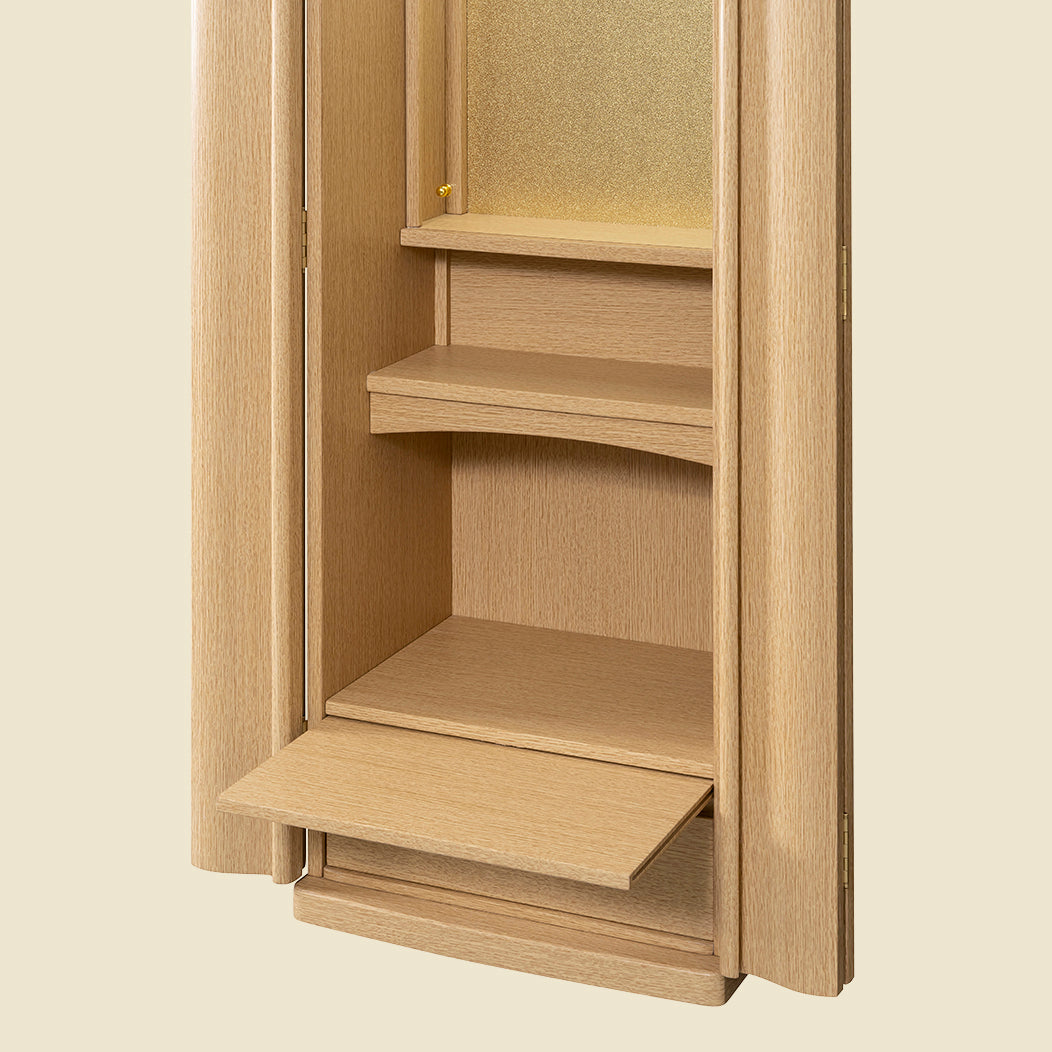 コンパクトながら機能・収納ともに充実しており、膳引きを利用することで、仏具スペースが広がり立体的な仏具配置が可能になりました。