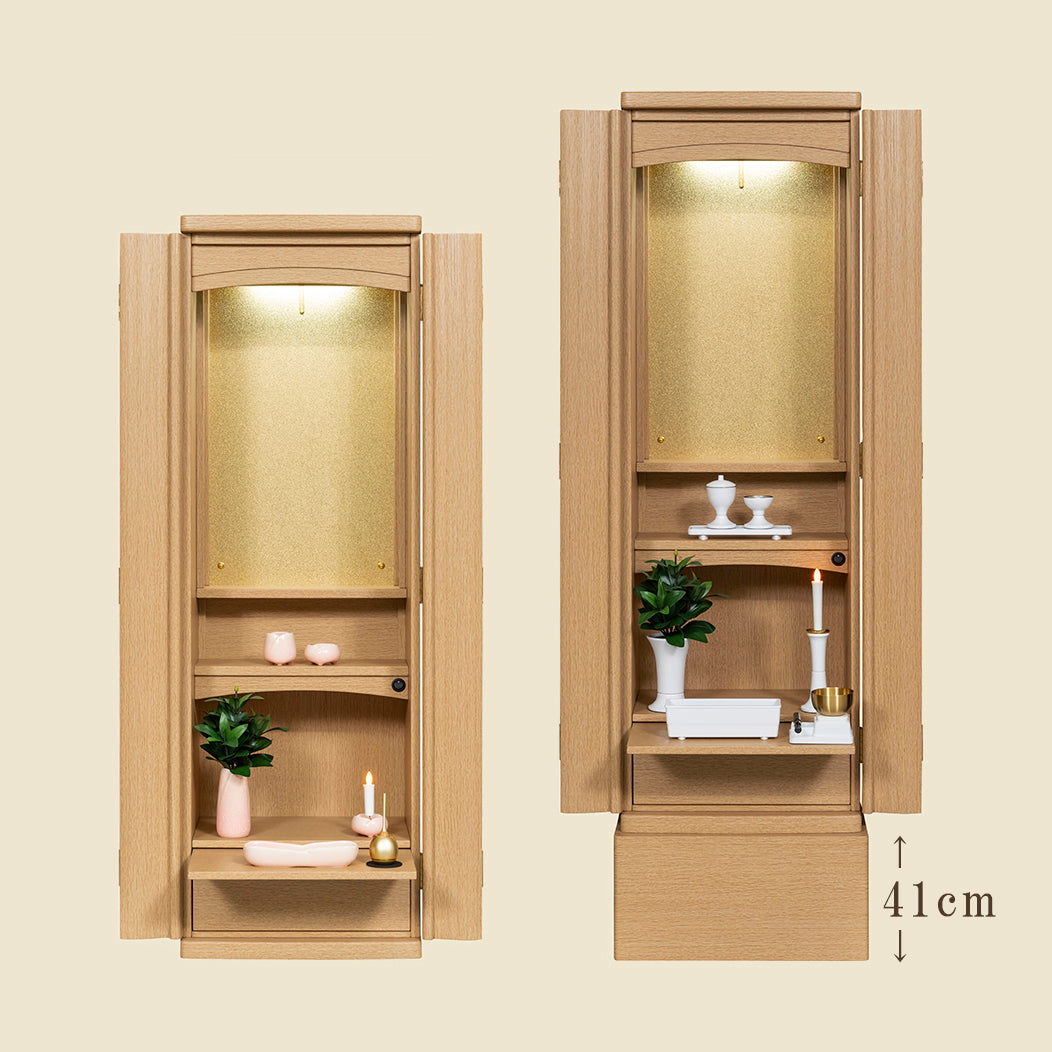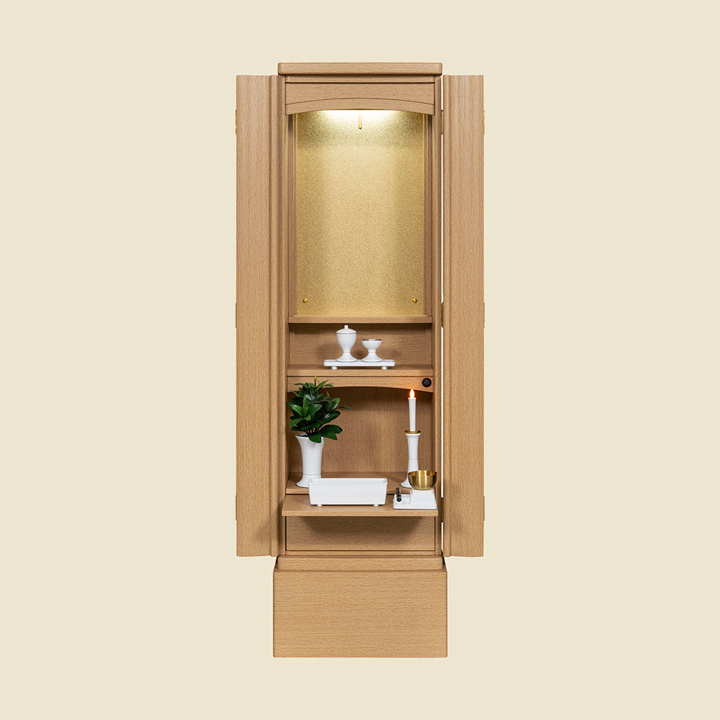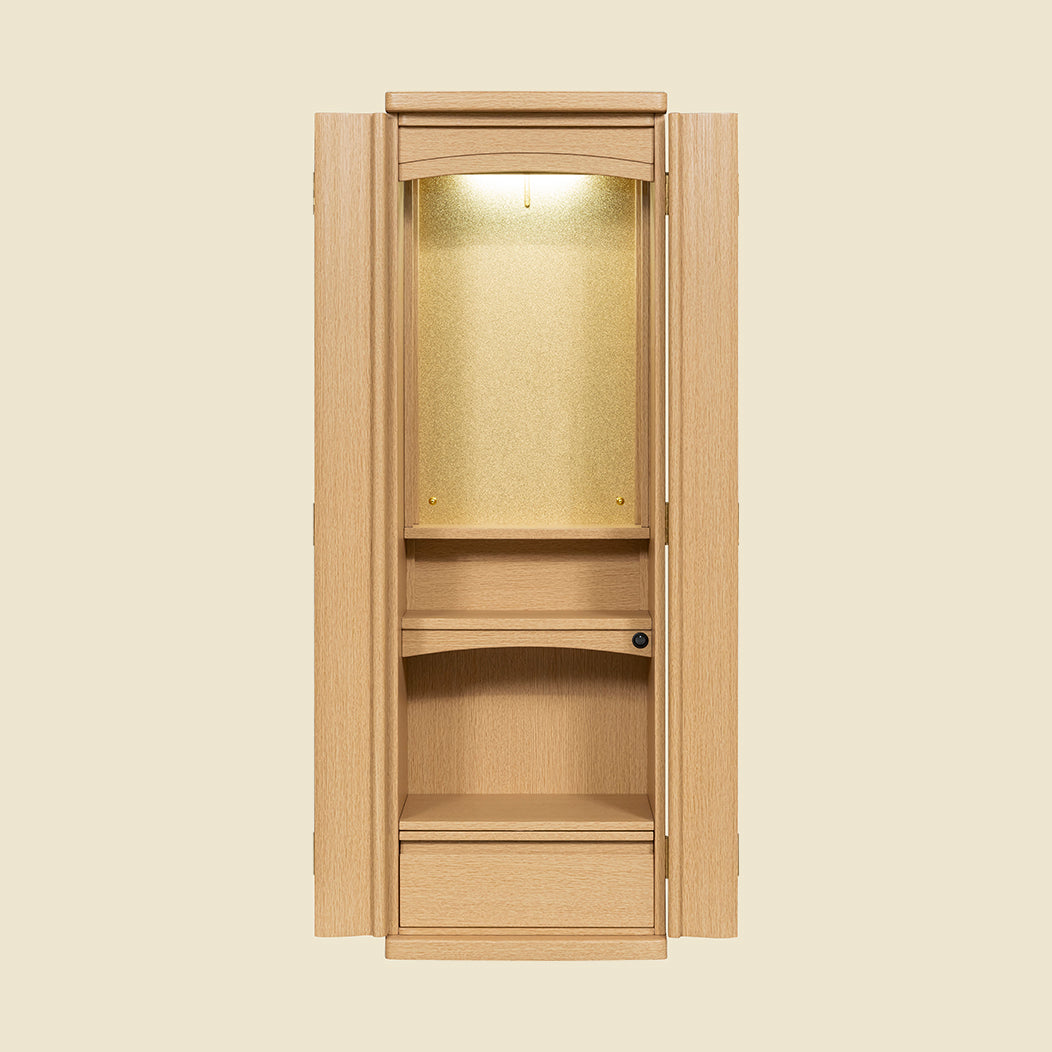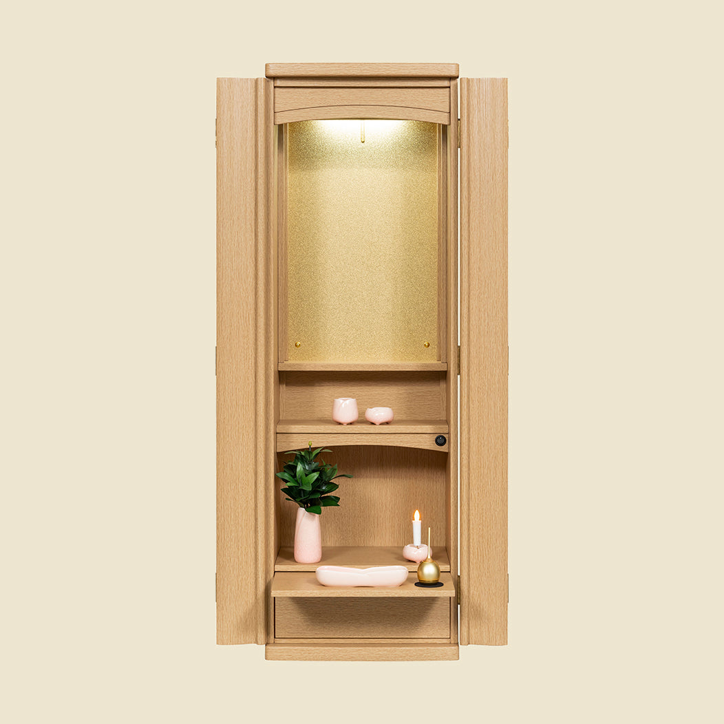 コンパクトながら機能・収納ともに充実しており、膳引きを利用することで、仏具スペースが広がり立体的な仏具配置が可能になりました。