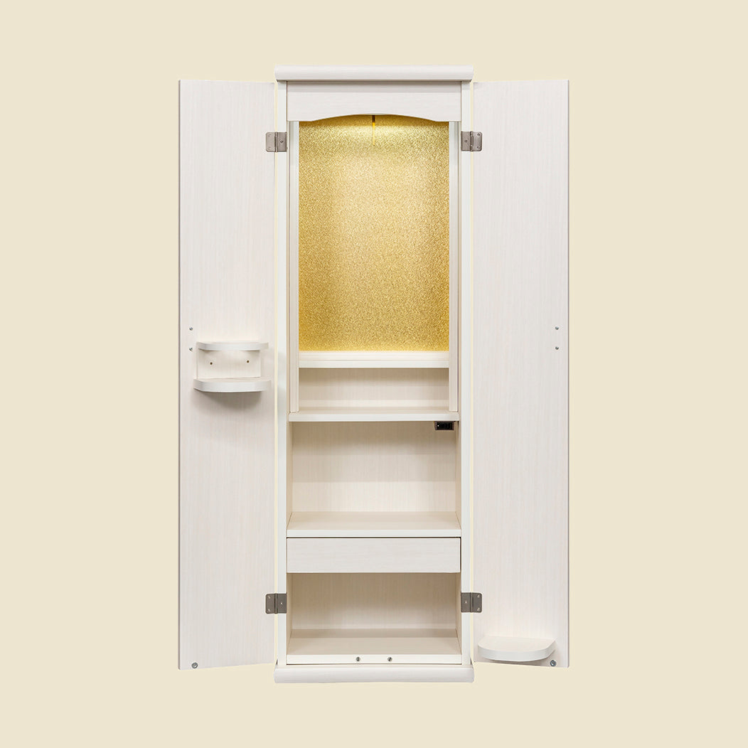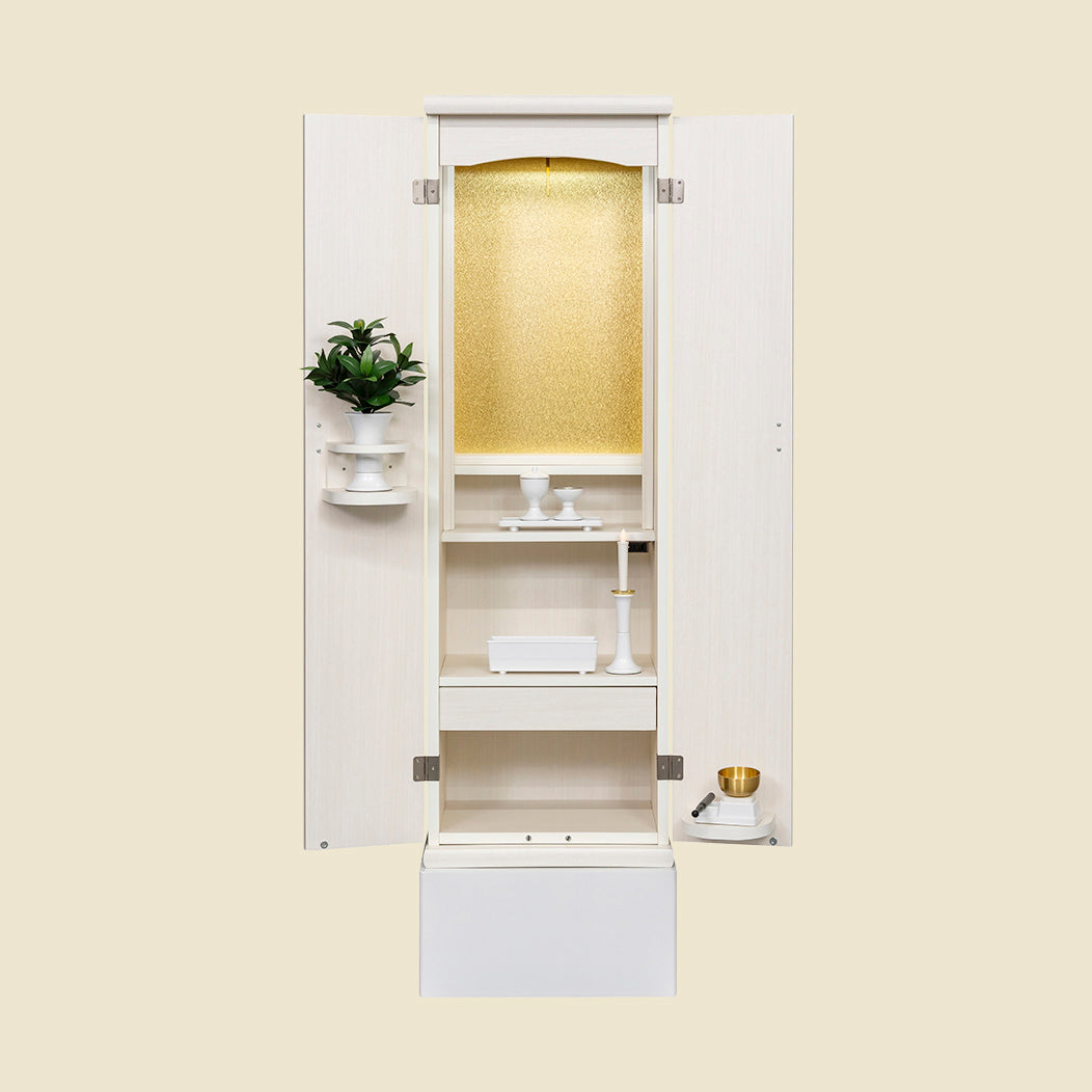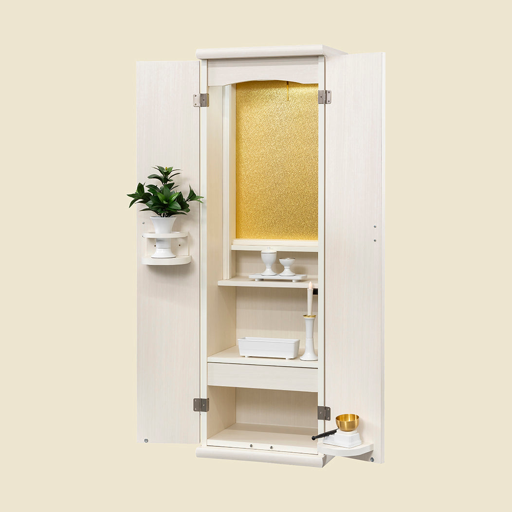 シンプルなシルエットに、軽やかな羽をモチーフにした大戸の飾り取手がやさしい印象を添え、落ち着きのある祈りの時間を演出します。