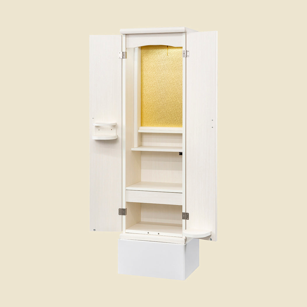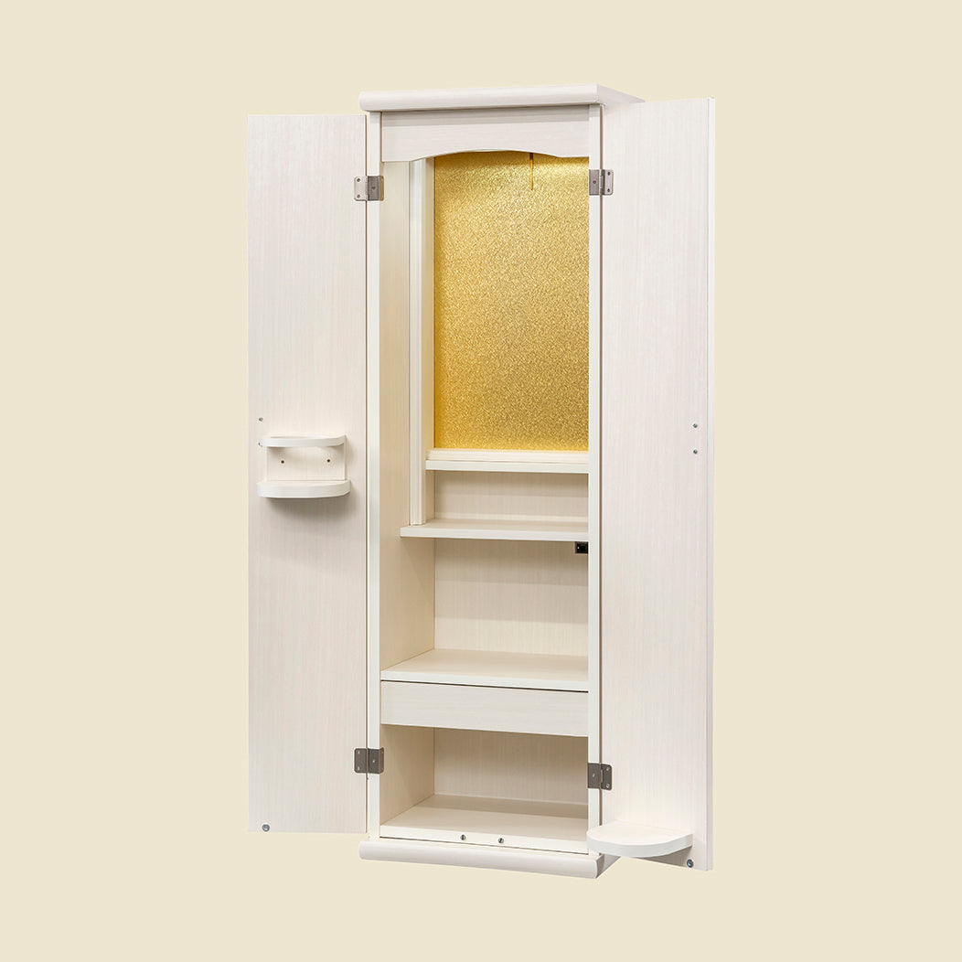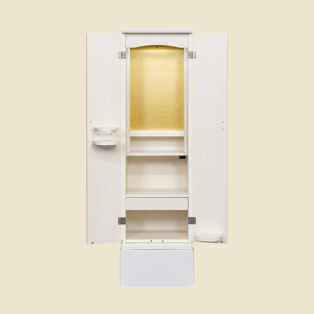 シンプルなシルエットに、軽やかな羽をモチーフにした大戸の飾り取手がやさしい印象を添え、落ち着きのある祈りの時間を演出します。