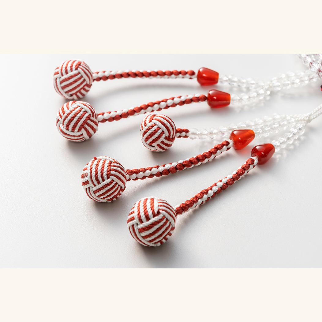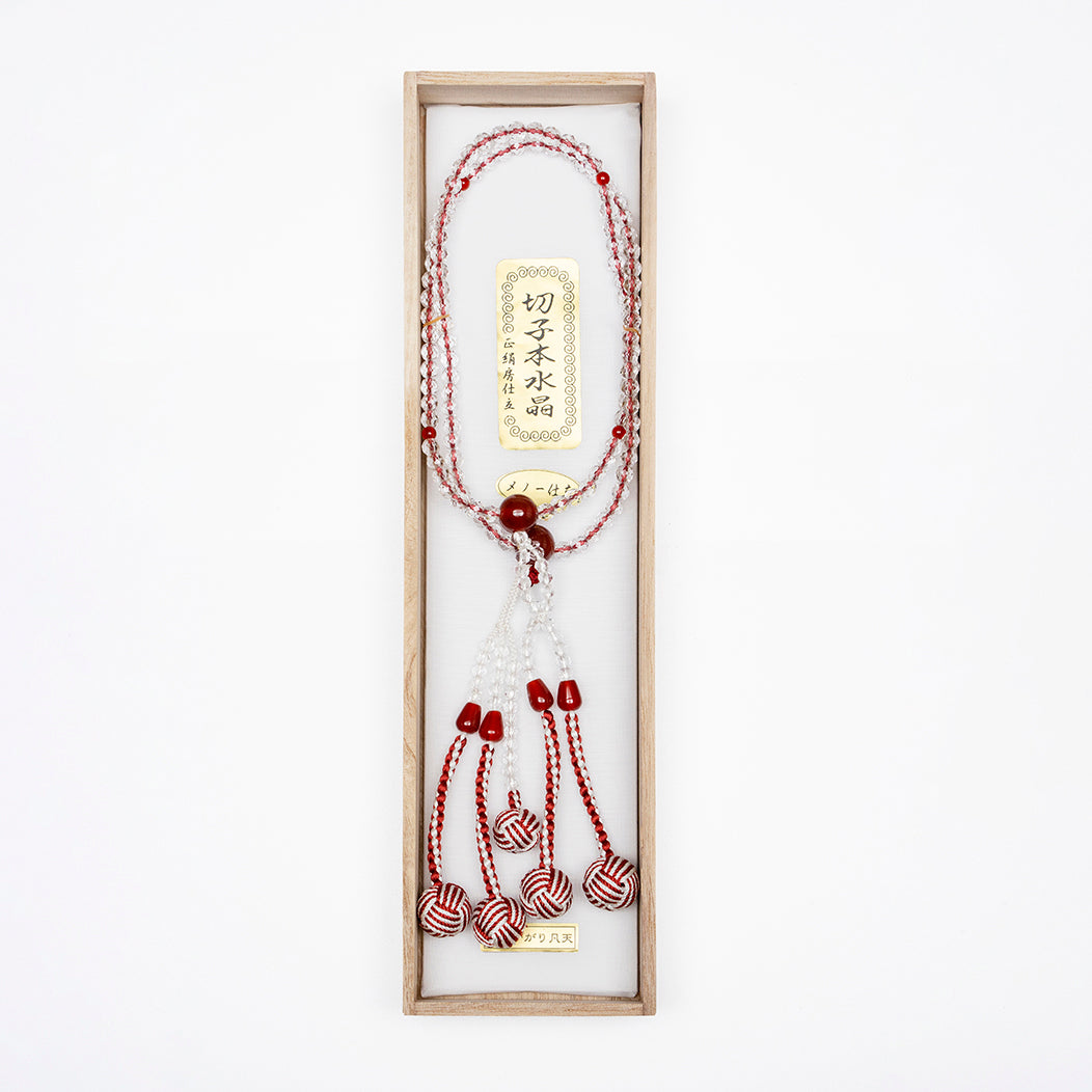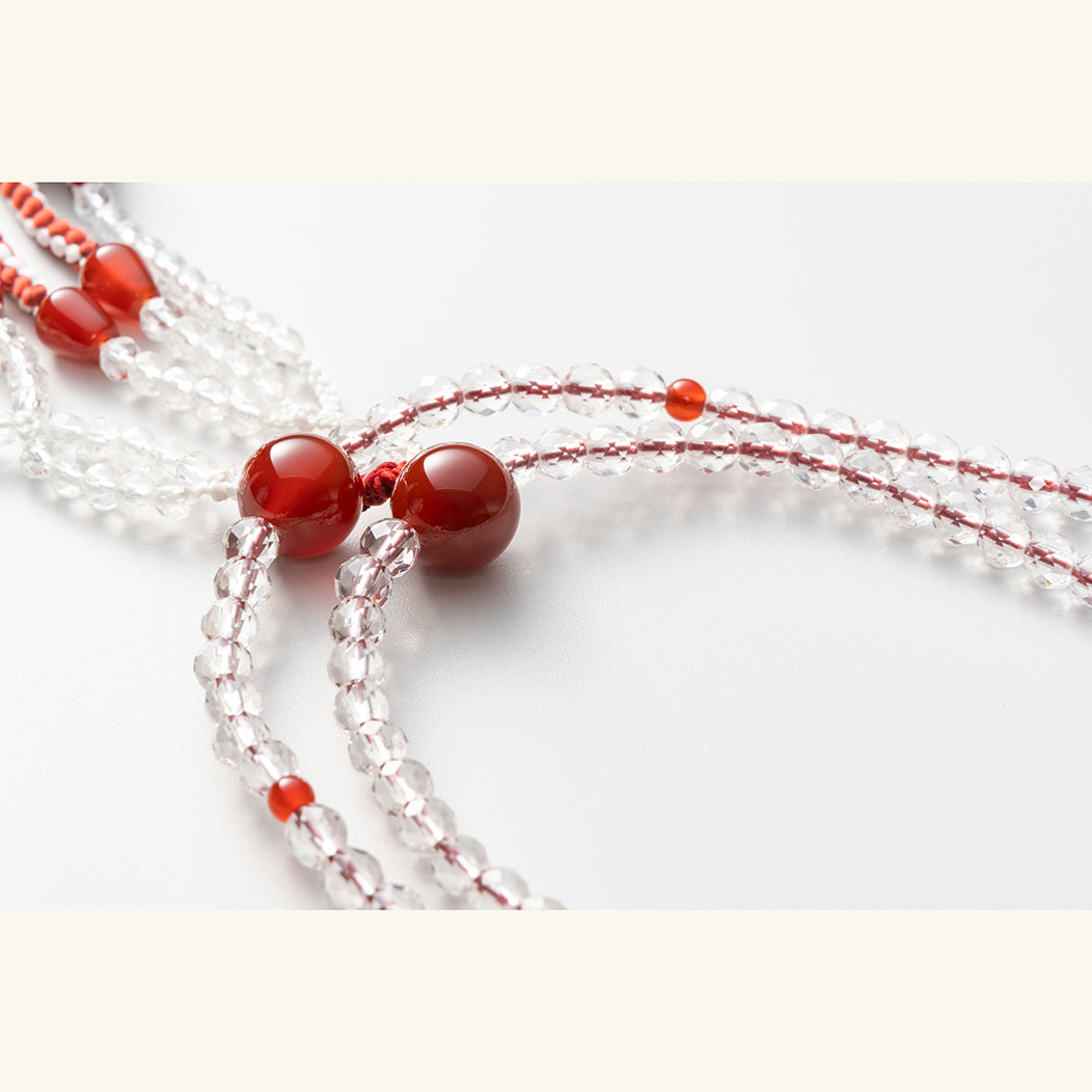 きらめく水晶と、赤めのう・中糸・縞かがり梵天の赤がメリハリを利かせた美しいお念珠です。