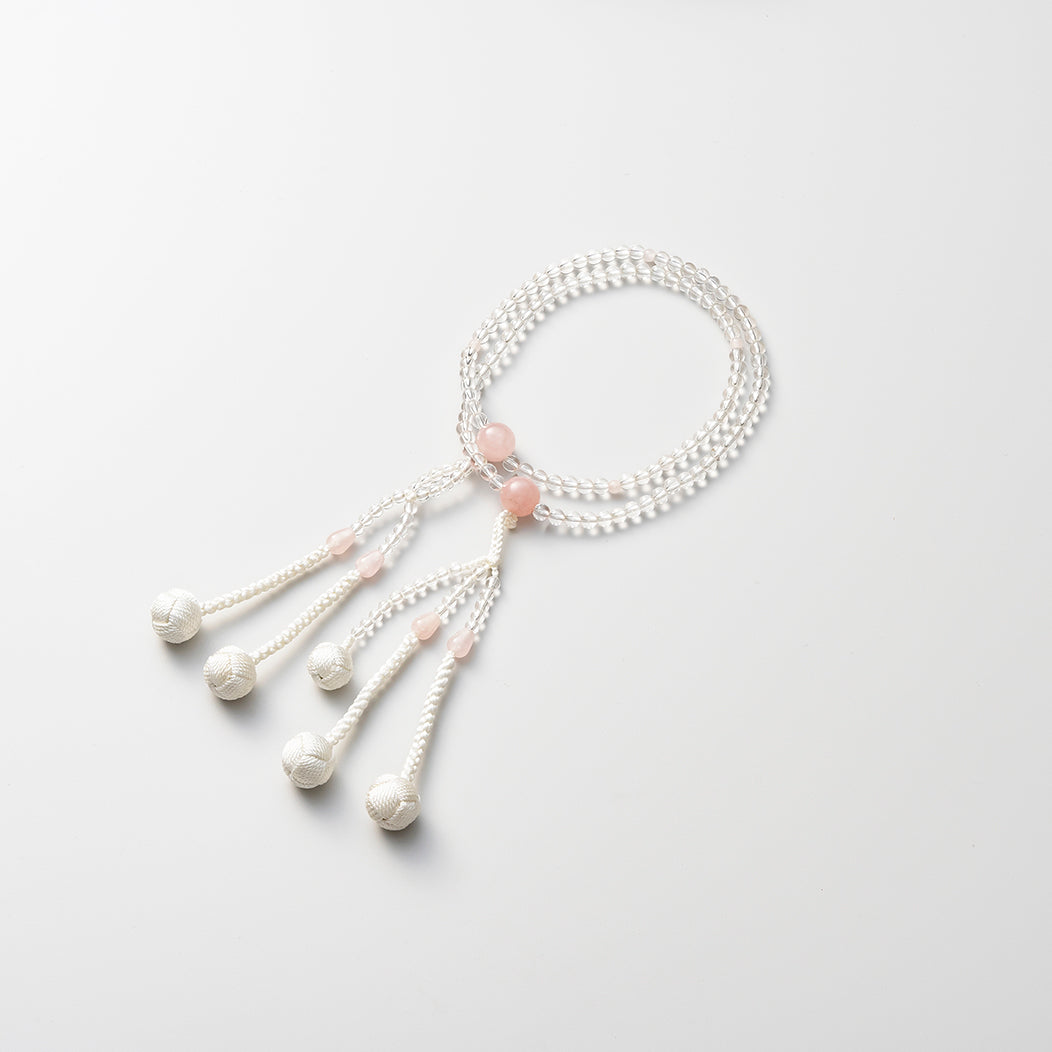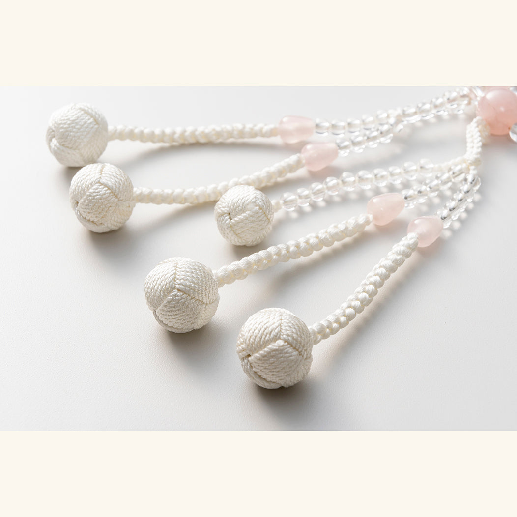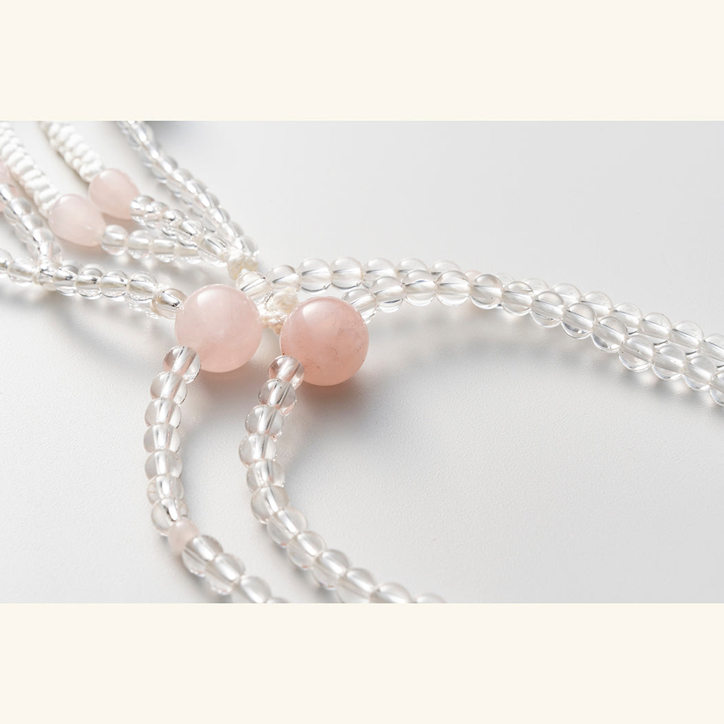きらめく水晶と、紅水晶のピンク色が可愛らしく、正絹のかがり梵天を合わせることで清楚さも感じられる美しいお念珠です。
