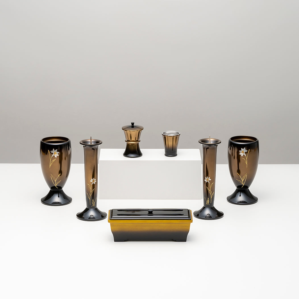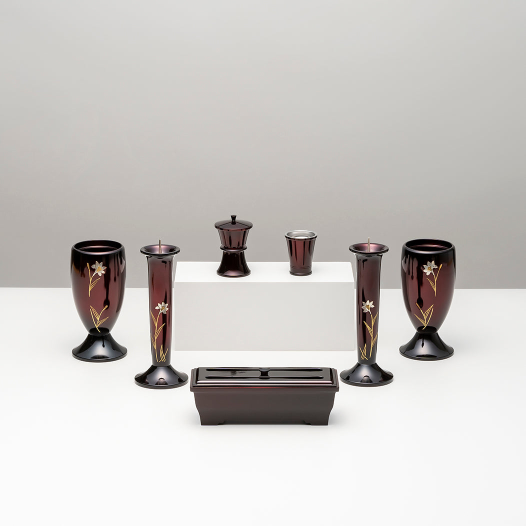 【5.2寸】花立:直径8 ×高15.6 /灯立:直径7.2 ×高19.7 /仏器: 直径4.7(上部)×高5.2 /茶器 :直径5.5(上部)×高8.2 /角香炉:角香炉:幅18.5×奥行7×高6(cm)