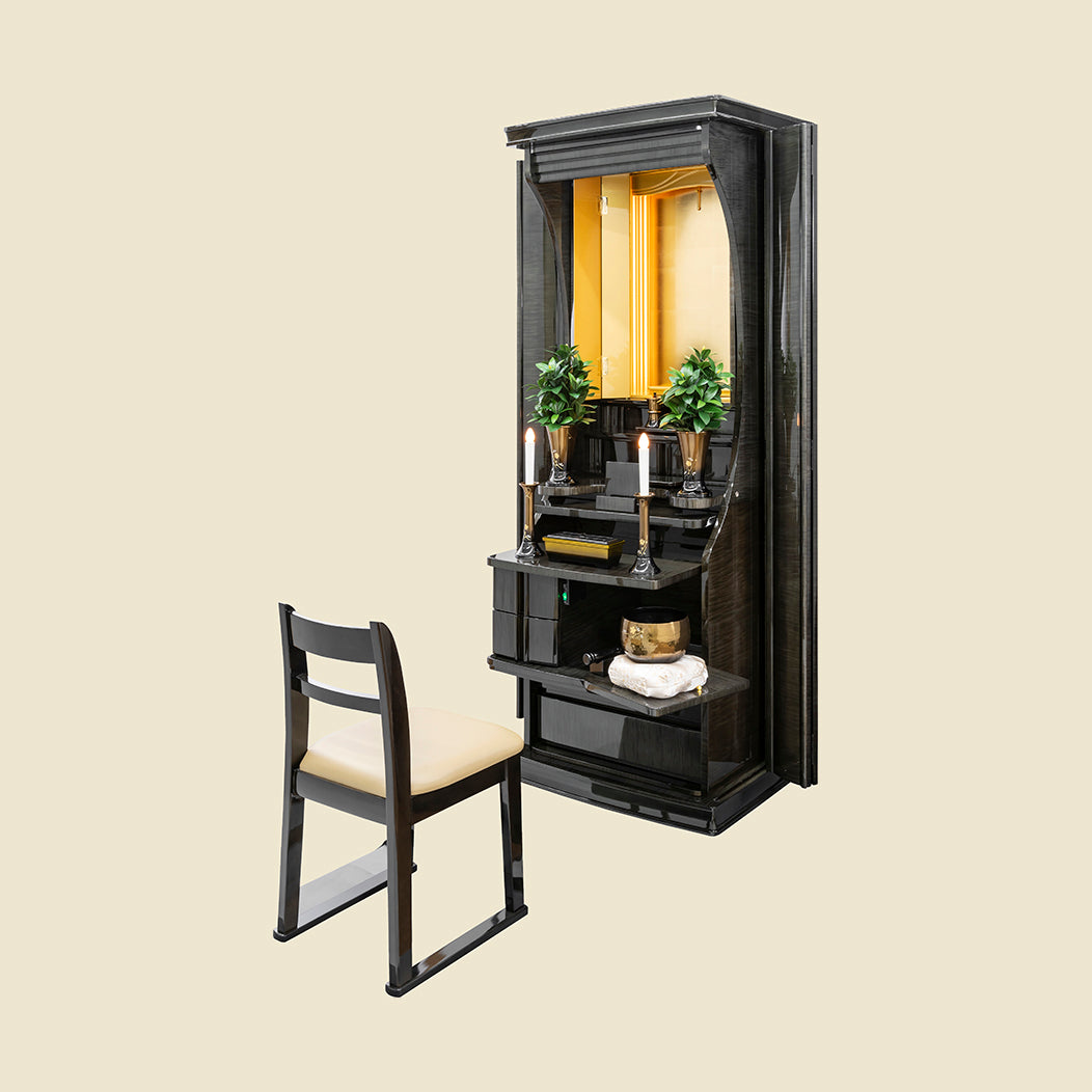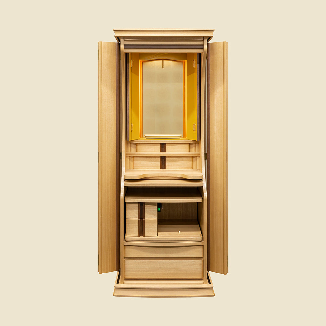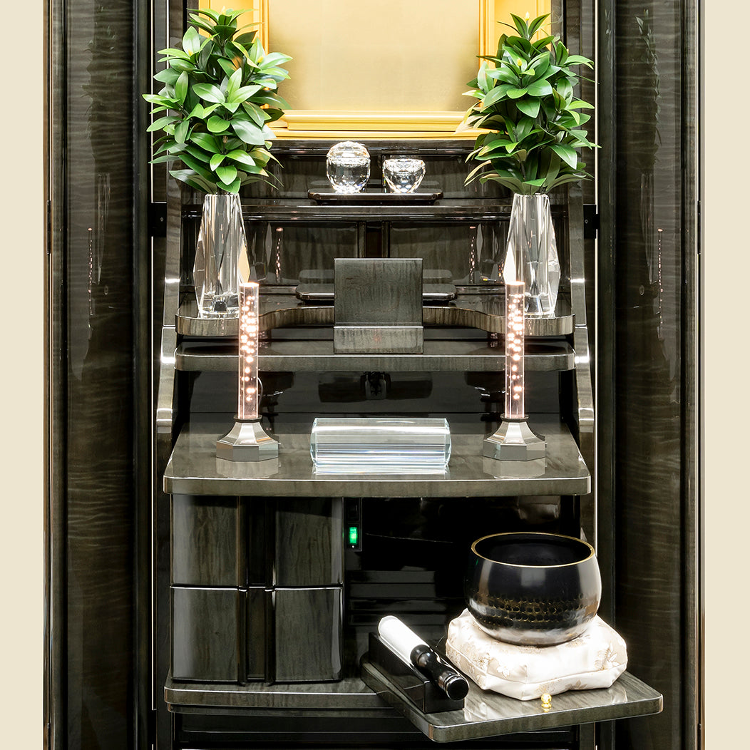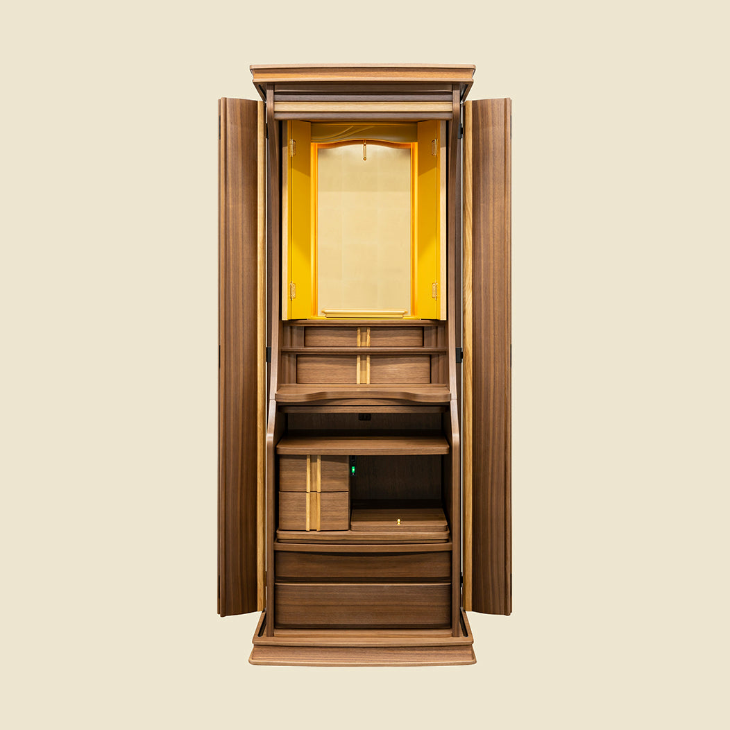 お仏壇側面の板を大胆にアールカットすることにより、斜めからでも御本尊を拝せます。 集会やご友人との祈りの時間をより有意義してくれます。
