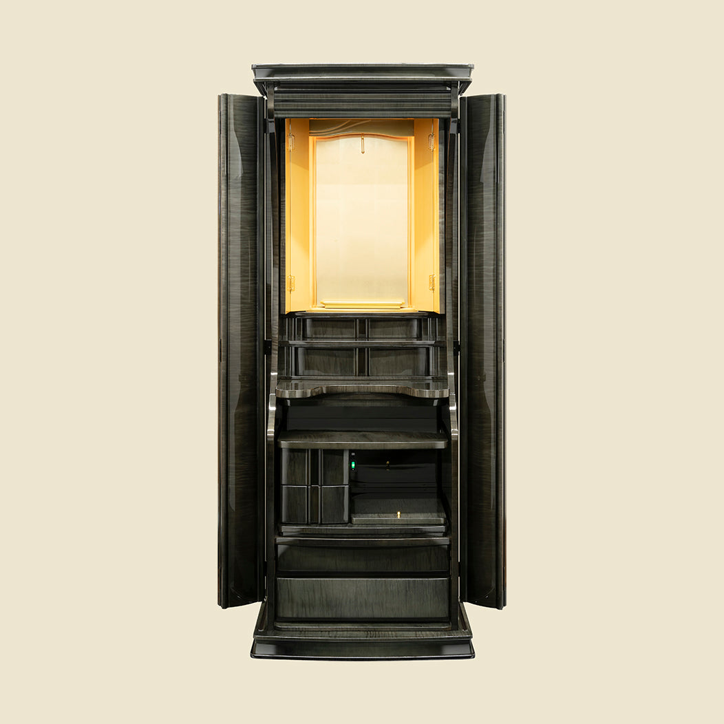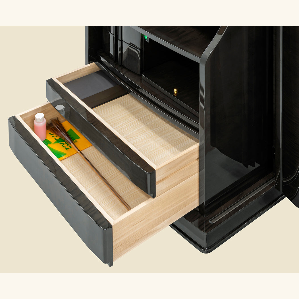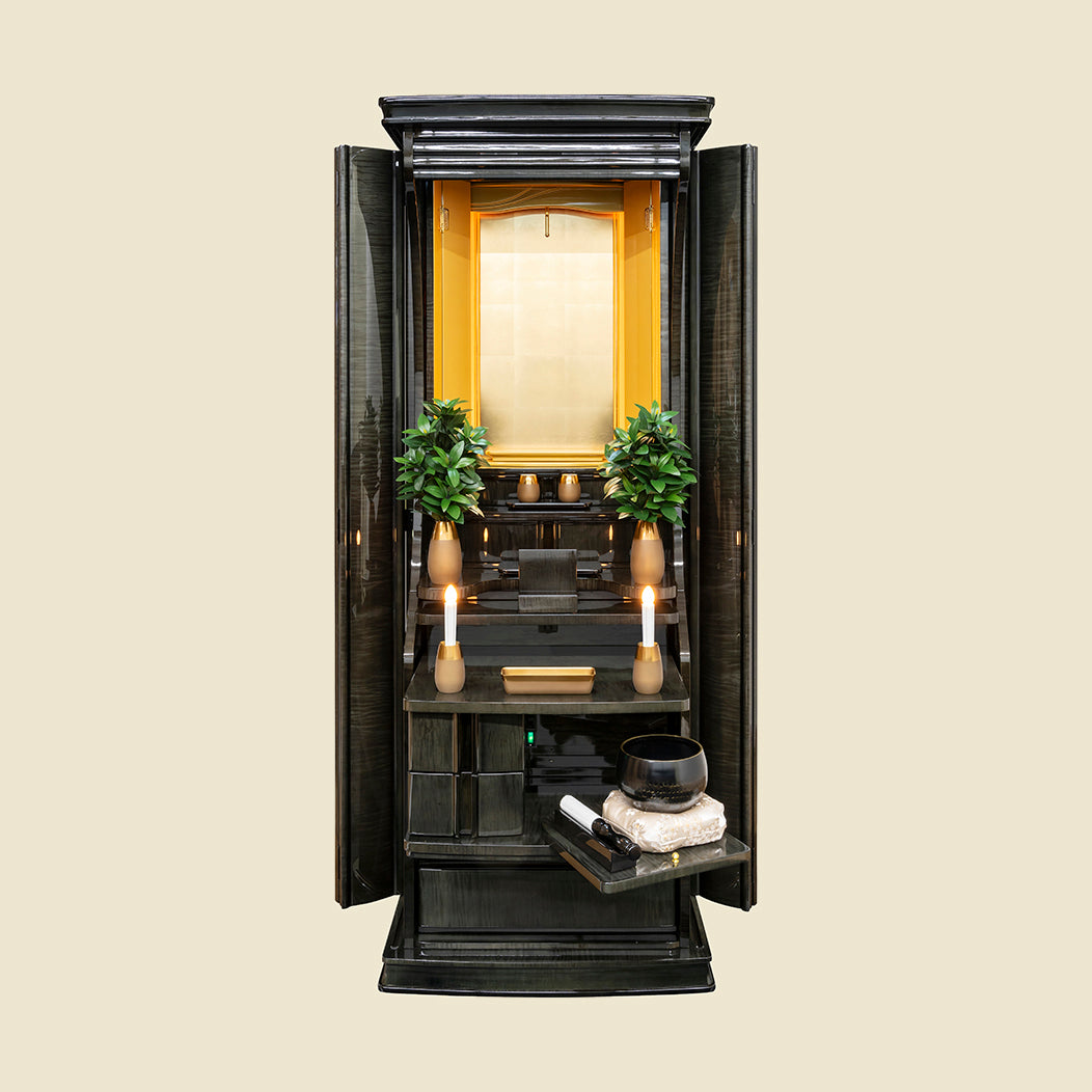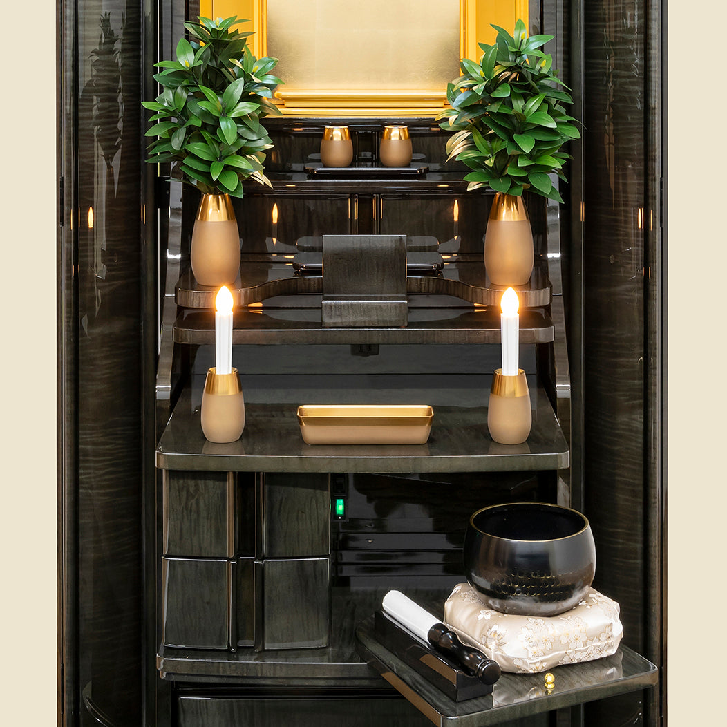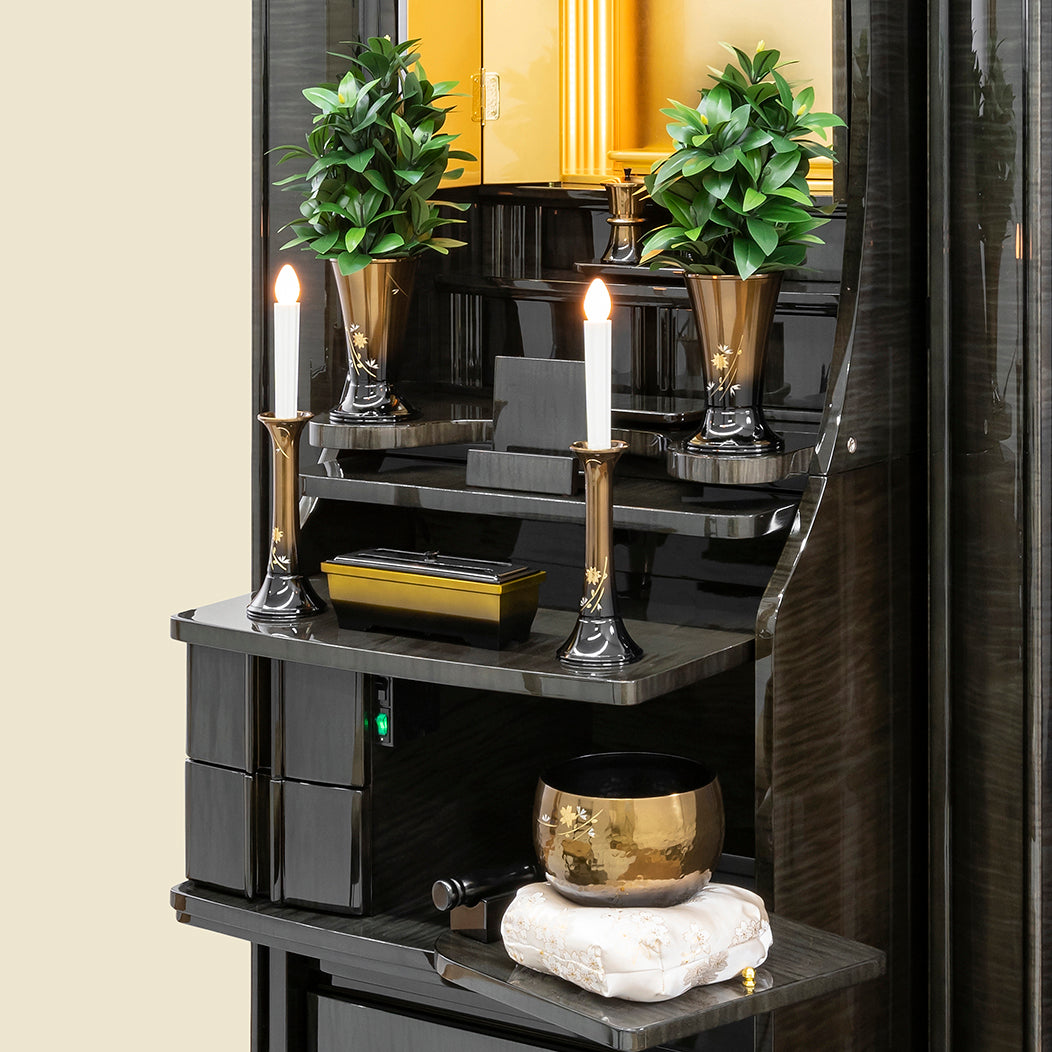 お仏壇側面の板を大胆にアールカットすることにより、斜めからでも御本尊を拝せます。 集会やご友人との祈りの時間をより有意義してくれます。